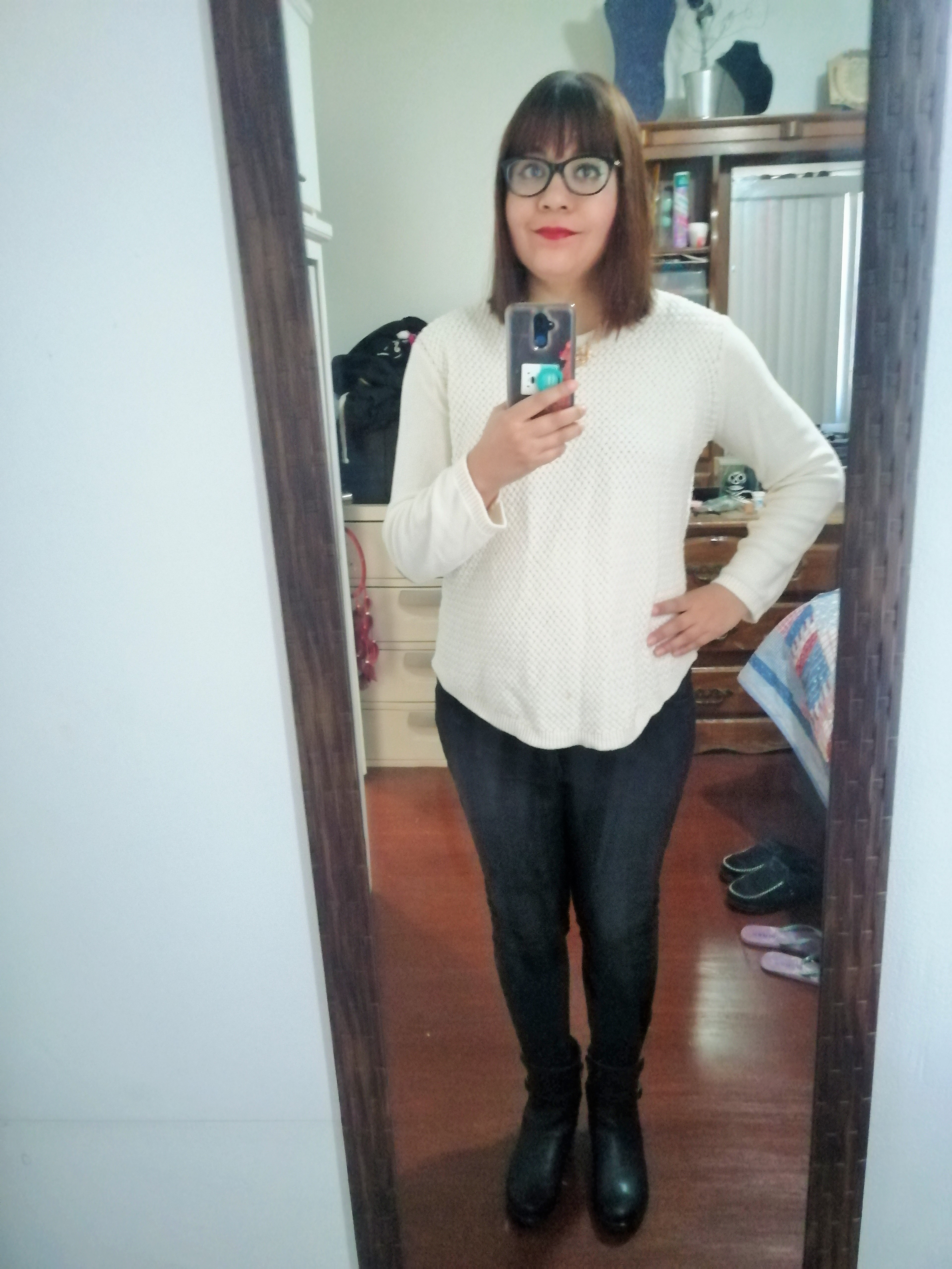 Hola, hoy les traigo otro outfit mío, combinando un suéter blanco que ya había vestido aquí, con unos jeans negros y mis botines de una hebilla.